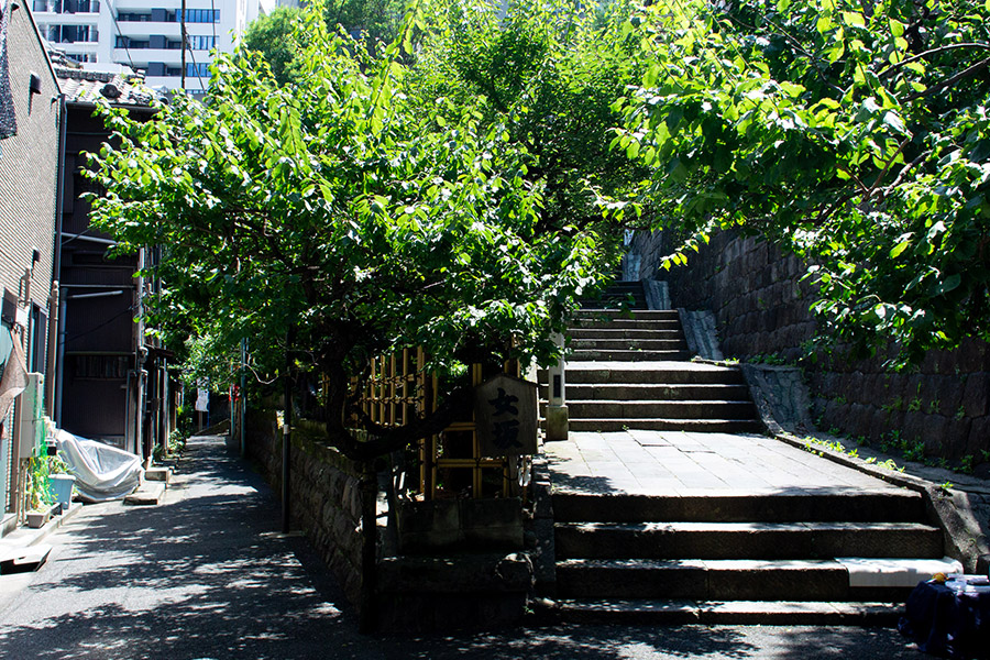 表参道側の石段。男坂は直線で力強く、女坂は緩やかに屈曲。梅や菊まつりの季節は装飾が映えます。