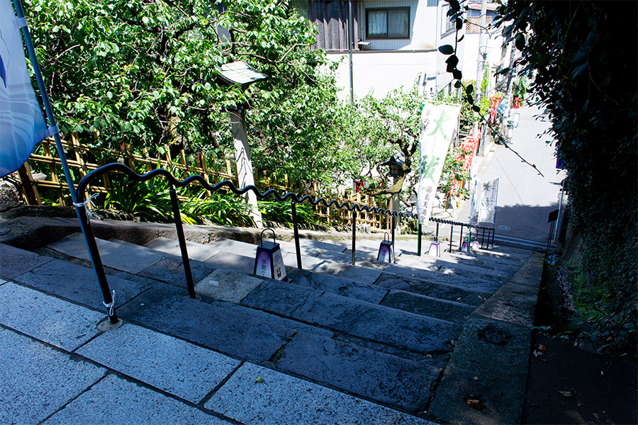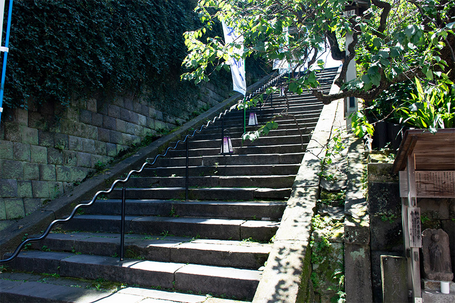 すぐわきにある、ゆるやかな坂・女坂に対して男坂という。