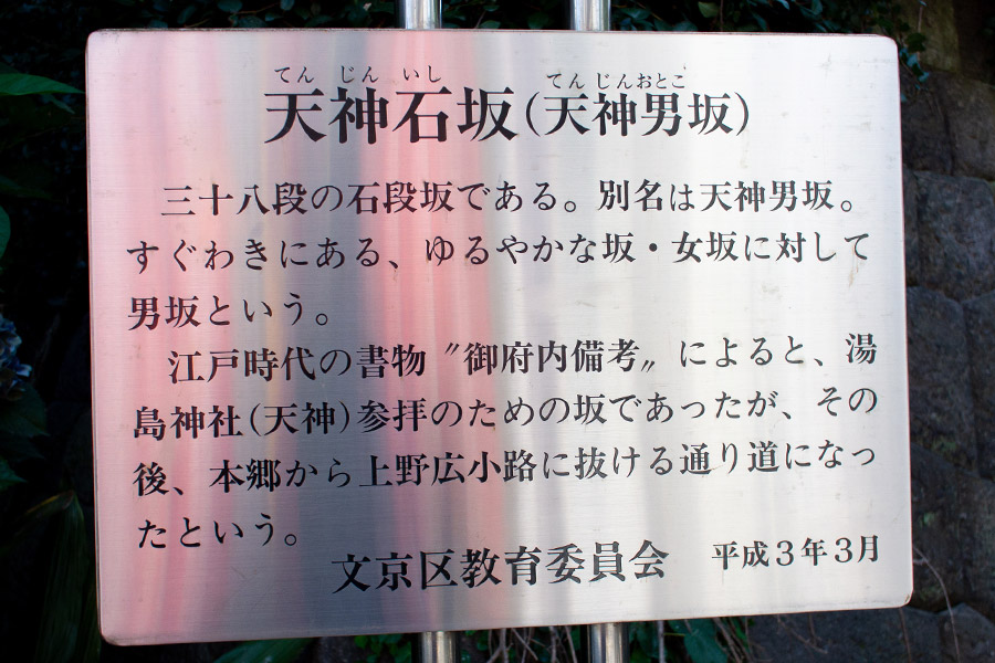 湯島天満宮の東側に位置するこの坂は、湯島天神の参道のひとつでもあり、「天神男坂(てんじんおとこざか)」とも呼ばれています。