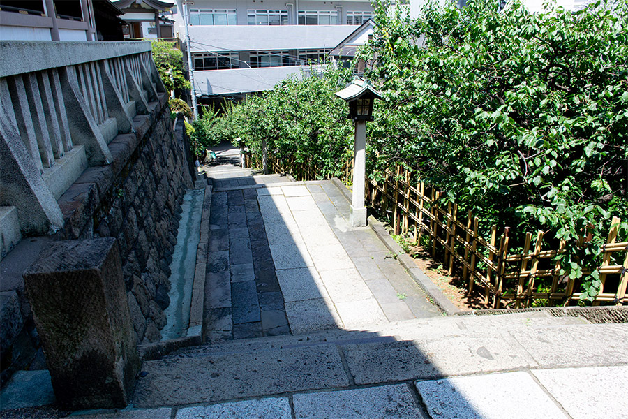 写真の左側の道をまっすぐ行くと、一直線で急勾配の男坂「天神石坂(てんじんいしざか)」があり、二つの坂はまるで対をなすような存在です。
