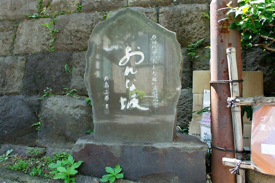 女坂の入り口には、歌手・原田悠里さんのCD『おんな坂』の発売を記念して建立された石碑があります。